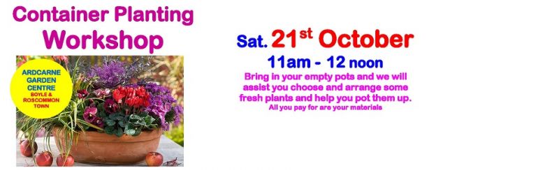 If your summer pots look a little tired right now, we have just the answer! Next Saturday morning we have a FREE Container Planting Workshop at both Ardcarne Garden Centre Boyle & Roscommon Town. Simply bring in your empty containers and we'll show you how to plant them up, using a selection of fantastic plants that will bring colour until spring.