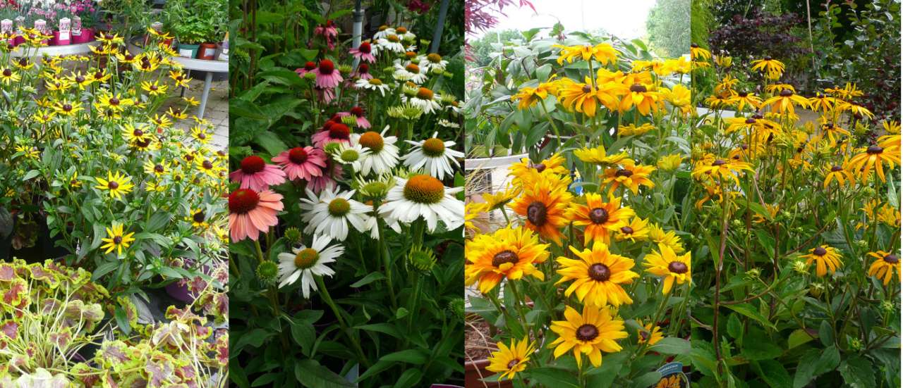 From Left to Right - Rudbecia 'Goldstar' with Heucherella 'Solar Eclipse in front, Echinacea 'Motivation' & 'White Meditation, Rudbeckia 'Sunset Yellow' (Front) & 'Starburst Solar' (Back) and Rudbeckia 'Goldsturm' - Photos taken at Ardcarne Garden Centre, Boyle - 01/08/2025