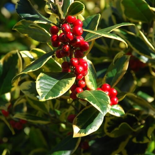Very hardy holly that will even tolerate coastal winds and fruits well in sun or shade. The yellow margins of the glossy, evergreen, foliage, free from spines, will add brightness and interest all year round. Best grown near a male holly to ensure a good crop of berries (surprisingly in the world of hollies the King is the female and the Queen is the male.)