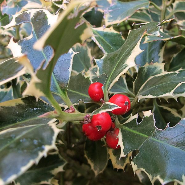 Popular male variety of holly that has an almost white variegation, with purple stems and a purple tinge to young foliage. For better berry production plant near a female holly such as 'Golden King'.