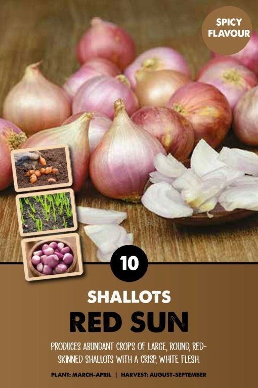Produces abundant crops of large round, red skinned shallots that have a firm skin and solid bulbs. Crisp, white flesh with a distinctive spicy flavour make these shallots ideal for eating raw in salads, pickling and cooking. Often considered as the best red skinned variety with long storage potential.