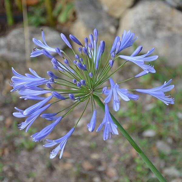 A dark-stemmed agapanthus with strap like leaves producing lilac-blue flowers in late-summer. This particular agapanthus makes quite a statement when planted en masse in a large sunny border. It is also excellent as a container plant where, as with most agapanthus, it may benefit from having its roots constrained, often producing more flowers as a result. Being potted has the added benefit of being able to bring the plant indoors over winter for added protection. If planted out in an exposed area they will need winter protection.