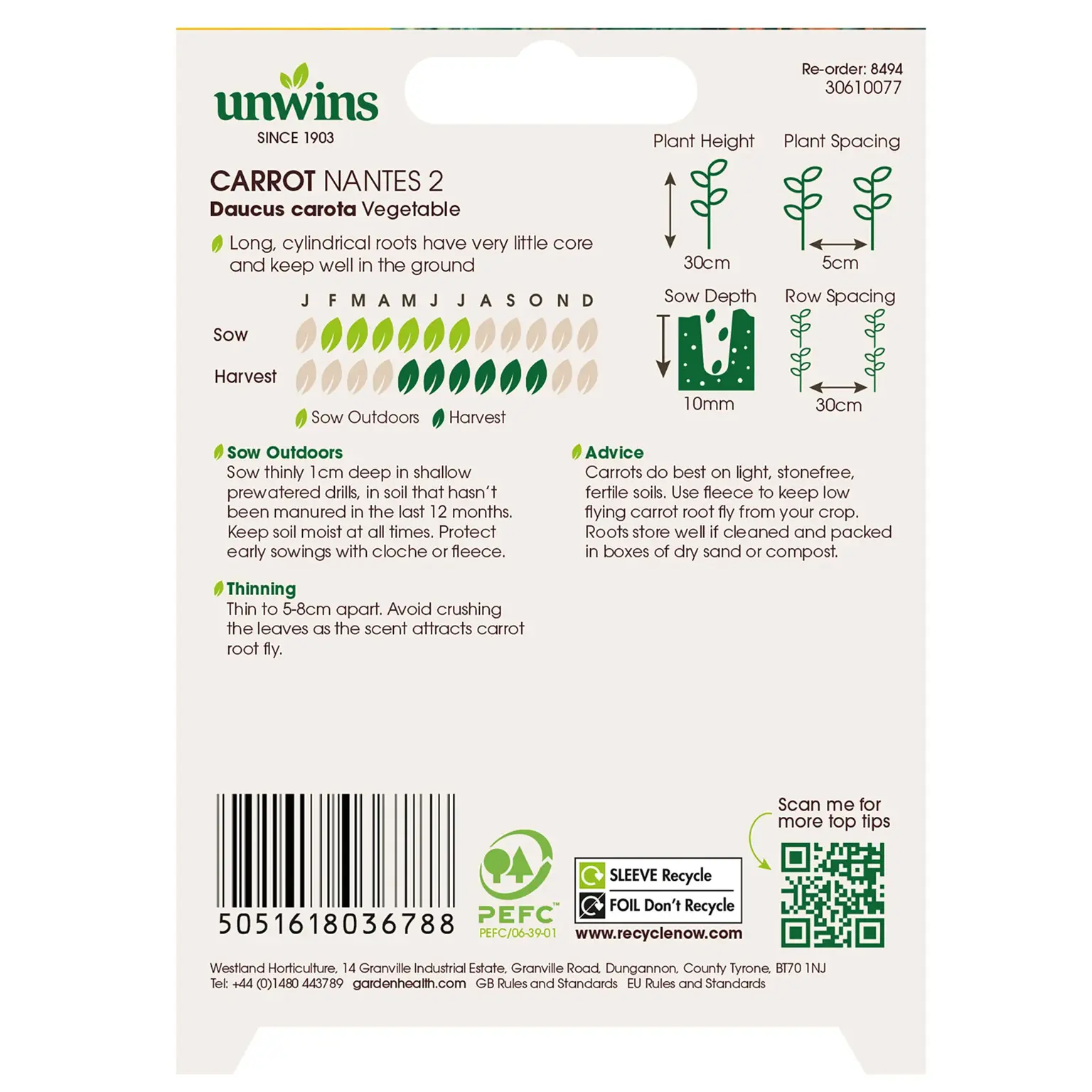 Unwins Organic Carrot Nantes 2 Seeds are an organic early harvest carrot variety. Producing tender carrots with a sweet flavour, these can be harvested as early as May.