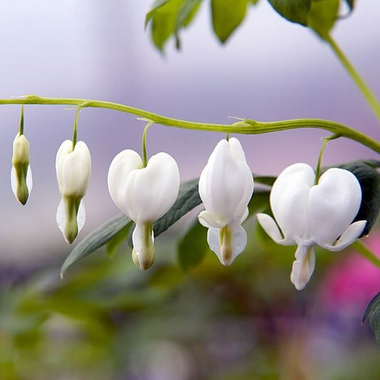 Now more correctly named Lamprocapnos spectabilis 'alba', this cottage garden favourite is known for its arching stems with suspended heart shaped flowers, which in this case, are almost pure white unlike its more common pink flowering cousin. Happy to grow in light shade, this plant looks particularly well grown in groups amongst your garden shrubs and performs even better in a sunny sheltered position.
