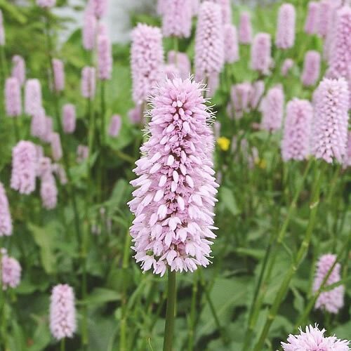 This robust variety of bistort is a perennial that produces fingers of pink flowers, from summer into autumn, on erect spikes that sway above the green foliage. It's love of poorly drained soils makes it ideal for planting near watersides or as a marginal pond plant, but it also looks well in a flower bed or grown up on slopes and banks.