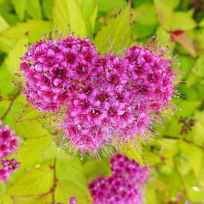A popular, RHS Award winning variety of spiraea loved by pollinators. Spiraea japonica 'Golden Princess' has a bushy habit with leaves opening reddish-bronze, becoming a rich gold colour in summer, then turning a reddish colour in autumn, providing interest through most of the year. Delicate looking rosy-pink flowers open as flattened heads in late summer.