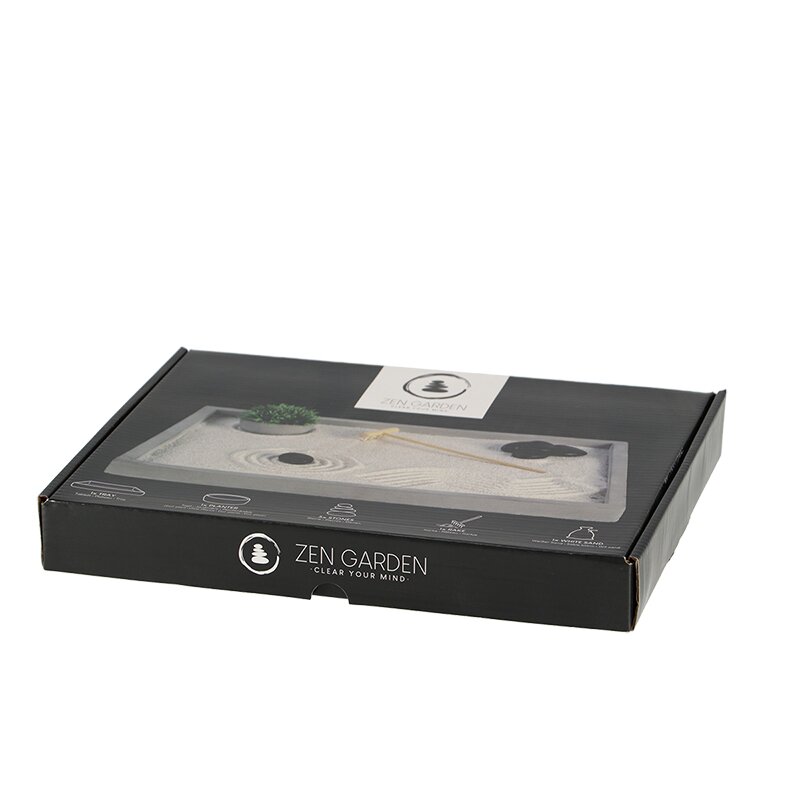 - set consists of a tray, white sand, stones, a planter and a wooden rake