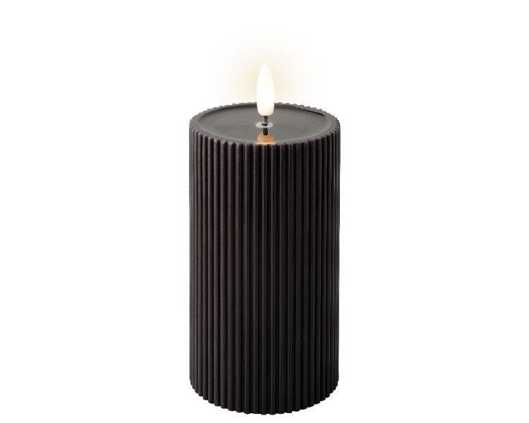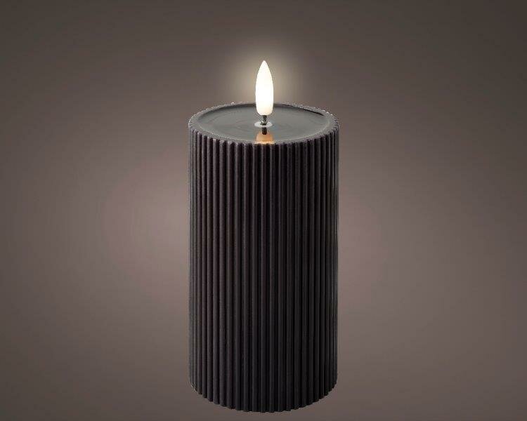 Black LED wick candle with wax effect, flat top and epoxy pit. Steady light for indoor use.