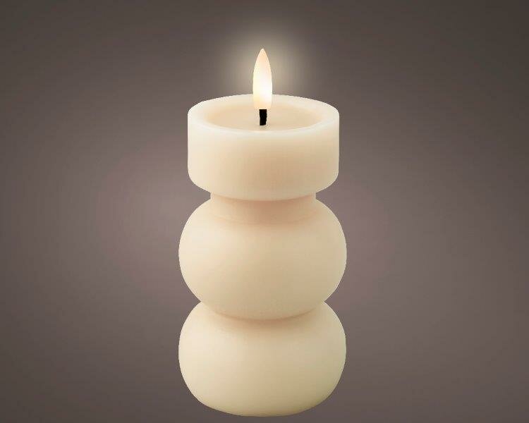 Cream LED wick candle with carved wax design and 'pit' on the top. Steady light for indoor use.