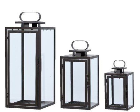 Iron lantern with brown paint finish and 4 glass panel sides.