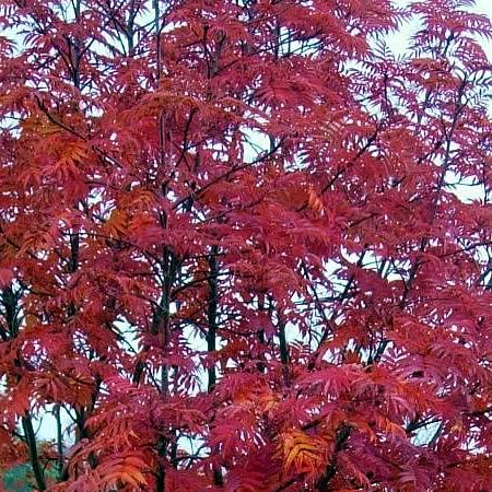 This Japanese rowan, is broadly a conical tree with a compact growth habit and foliage that turns from green, to yellow then red in autumn. Creamy white flowers in spring are followed by orange/red berries through late summer/autumn.