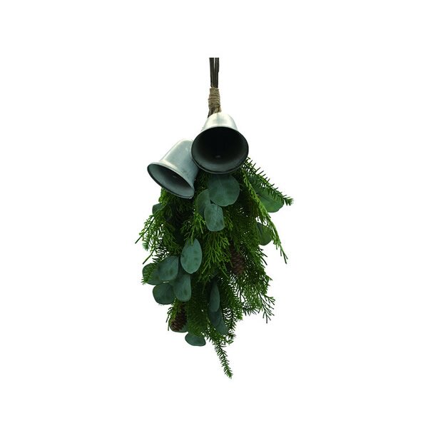 Hanging bells decoration with artificial green eucalyptus, pine leaves and cones.