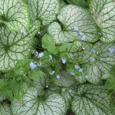 A beautiful garden addition with its silver-grey leaves and pronounced dark veins, suitable for moist conditions. Blue forget-me-not flowers in spring.