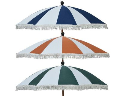 Polyester, water repellent parasol, with brown, powder coated aluminium pole available in 3 designs. Available in store only as we cannot guarantee availability of colour preference when ordering online
