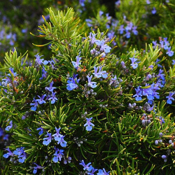 Rosemary is an attractive evergreen shrub with needle-like leaves often used in cooking. Small pale blue flowers are often produced in spring and can repeat flower through the year. This is the more common, upright variety of the herb.