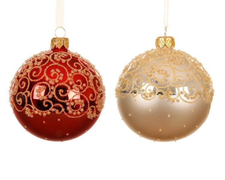 Glass bauble with shiny curl decorated top and matt bottom, available in red or pearl - please state preference in the comments when ordering