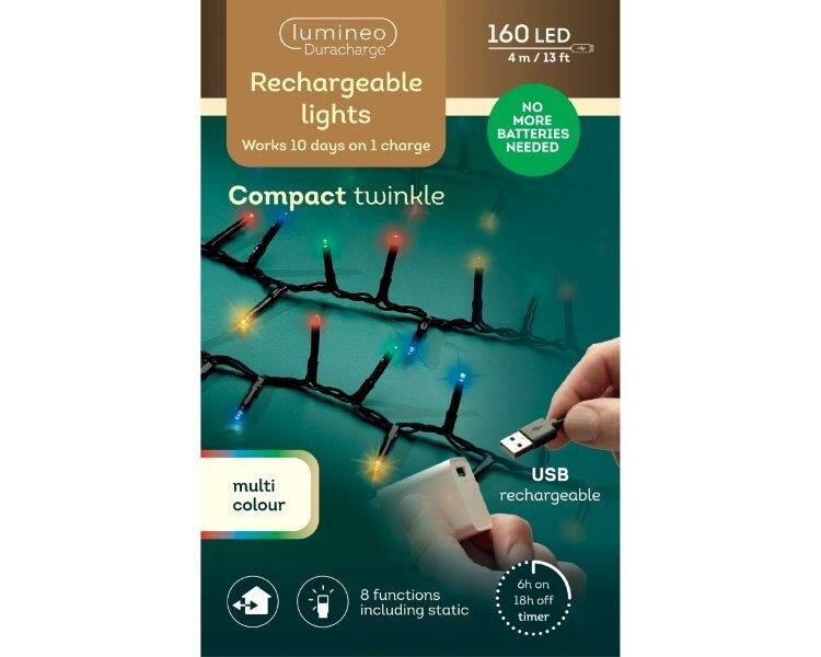 160 LED duracharge compact lights with 8 function twinkle effect suitable for outdoor use, reacharge via usb cable included.