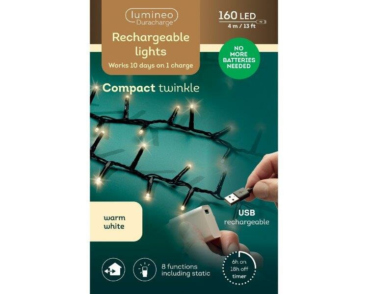 160 LED duracharge compact lights with 8 function twinkle effect suitable for outdoor use, reacharge via usb cable included.