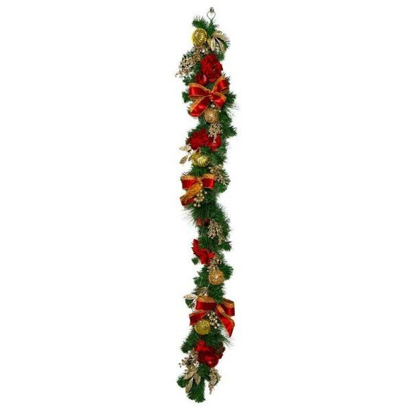 6ft artificial green wreath with red hydrangea, plus gold, red and champagne details.