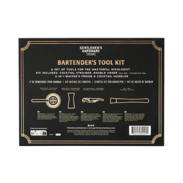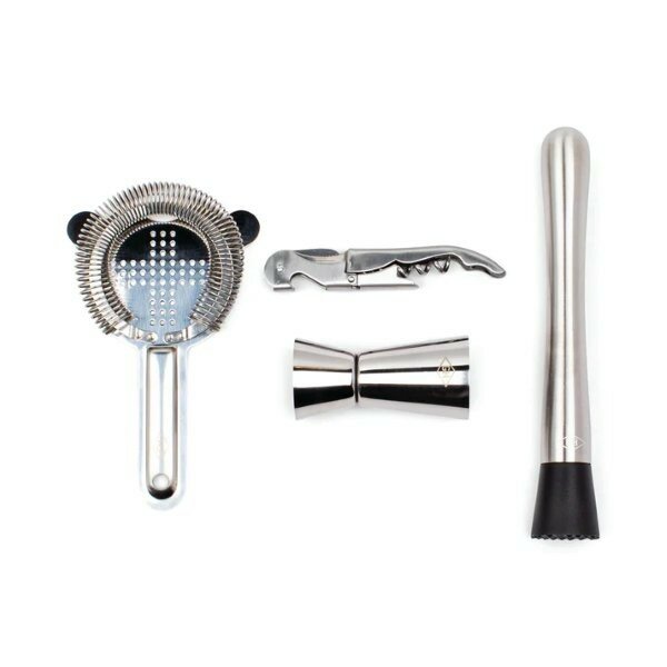 A set of tools for the masterful mixologist. The kit includes: cocktail strainer, double jigger (50 & 25ml / 1.7 & 0.85 us fl oz)4-in-1 waiter’s friend & cocktail muddler
