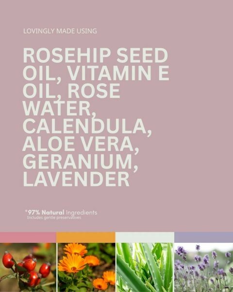Aqua (Water), Rosa Damascena Flower (Rose Water) Water, Rosa Canina (Rosehip) Seed Oil, Helianthus Annuus (Sunflower) Seed Oil, Vitis Vinifera (Grape) Seed Oil, Glycerin, Aloe Barbadensis Leaf (Aloe Vera) Juice, Calendula Officinalis Flower (Calendula)Oil, Lavandula Angustifolia (Lavender) Oil, Phenoxyethanol, Ethylhexylglycerin, Potassium Sorbate, Sodium Benzoate, Benzyl Alcohol, Coumarin, Geraniol, Linalool, Limonene, Citral, Citronellol, Carbomer, Aminomethyl Propanol.