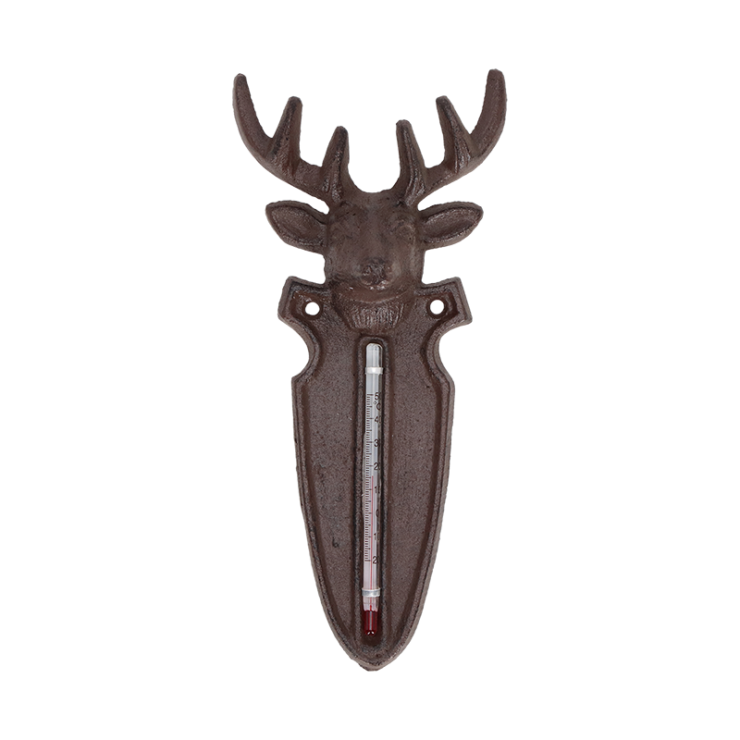 With this rustic cast iron wall piece game will come to your house or garden in a decorative deer head thermometer, and displays the temperature in both Celsius and Fahrenheit. This cast iron object has been hand cast according to age-old tradition and craftsmanship.