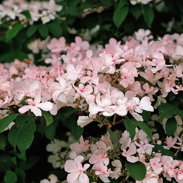 Deciduous viburnum producing a profusion of white, lace-capped flowers that become flushed pink as they mature into summer. The flowers are followed by red, ornamental berries that turn black against the green foliage which turns shades of orange and red in autumn for added interest.