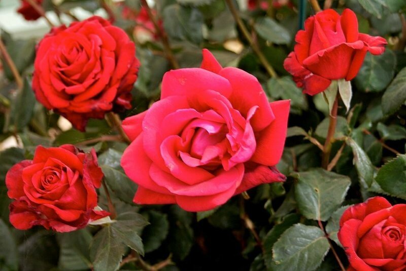 The perfect anniversary gift, this hybrid tea variety is a repeat flower, producing masses of lush, fragrant, red blooms from summer into autumn with regular dead-heading. The red roses look particularly vibrant against the dark green, glossy foliage and the plant has good disease resistance.