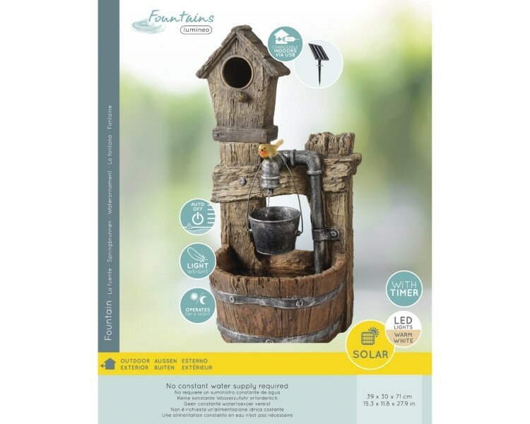 Solar powered polyresin water feature in barrel-well design.