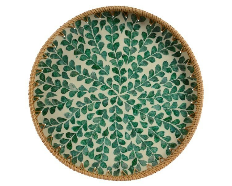 Round rattan tray with leaf pattern base.