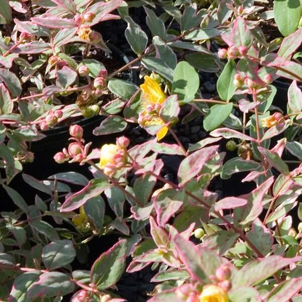 A spreading shrub with red young stems bearing foliage that matures through three colours green, pink and cream, giving it the tricolour name. Cup-shaped yellow flowers are produced through summer and early autumn.