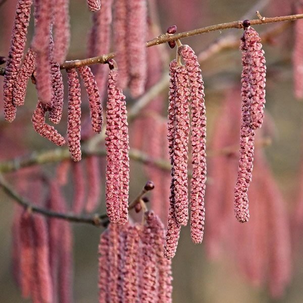 As the name suggests, this hazel has distinctive dark purple leaves throughout the season, becoming flushed with green later in the season. Its twisted branches add a extra interest through winter when it also bears purplish-pink catkins