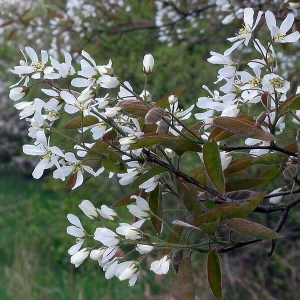 The 'Snowy Mespilus' or 'Juneberry' is a large deciduous shrub or small tree that has bronze tinged leaves turning a beautiful orange/red in autumn. The purple-black berries that are formed later are loved by native birds.